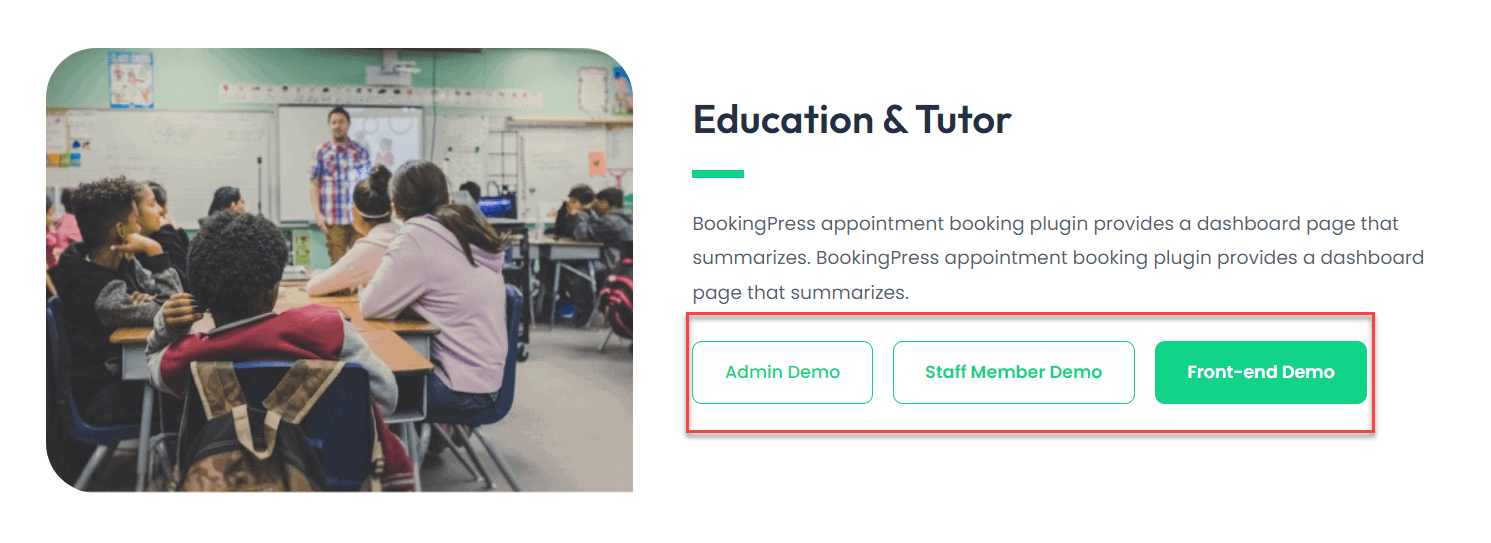 If you feel a bit skeptical and want to know what your website’s front end and back end will look like after installing and configuring the BookingPress plugin, they have got you covered. The development team at BookingPress has created several demo WordPress sites to show you how the plugin performs in different scenarios.