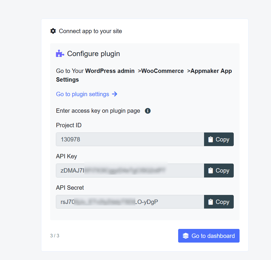Once you have installed and activated the plugin, your Appmaker screen will show your unique project ID, API Key, and API secret. Copy them and place them somewhere handy because you’ll need them in the next steps.