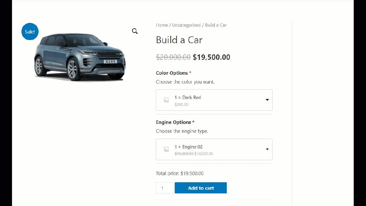 In our product, we have configured the product’s price as $19,500. To customize the options and choose different colors and engines, use the dropdown.
